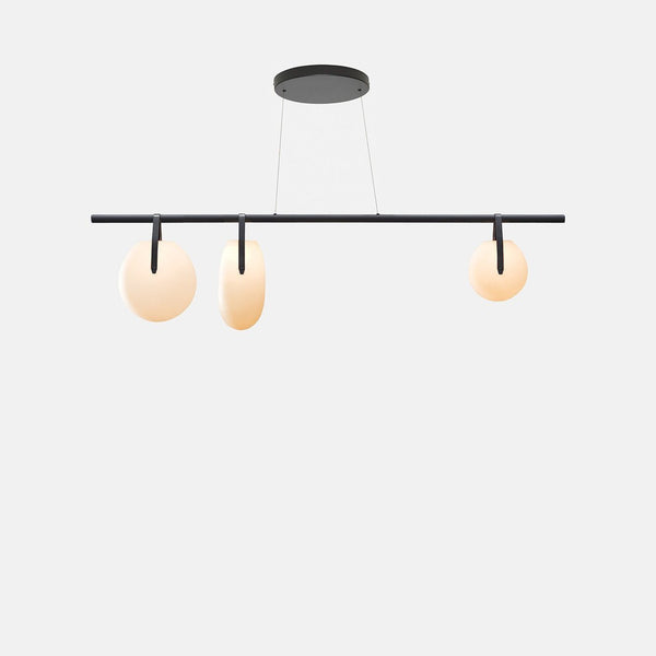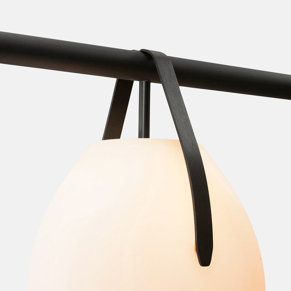 It is a minimal, near-weightless take on the chandelier, rethought as a simple beam with power cords hidden inside the slim suspension cables. Its ivory-frosted glass fixtures, fixed in a variety of compositions, bring to mind hanging fruit. Voluptuous and handblown, each orb is subtly unique.