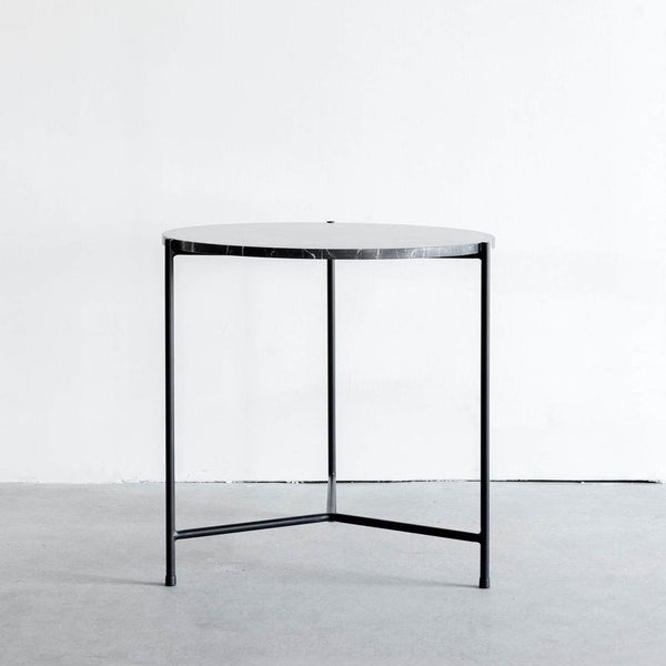 This Side Table is Custom Made in Los Angeles. The marble slab is cut tosize and honed. The metal is bent to form and welded.
